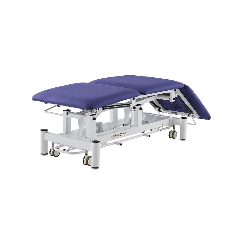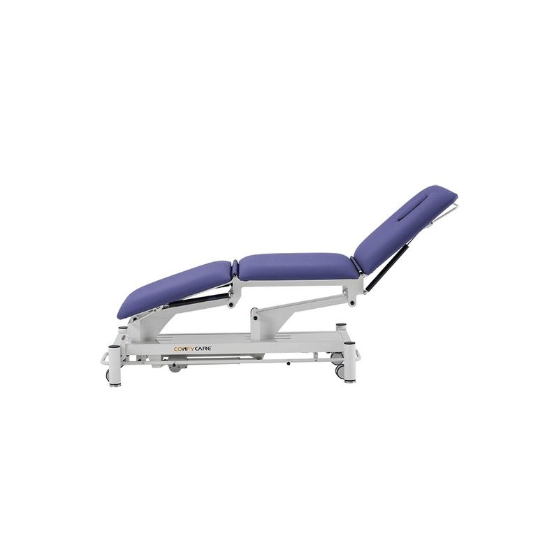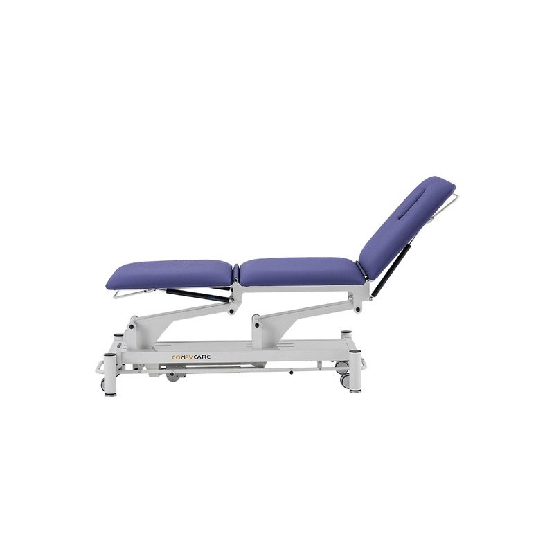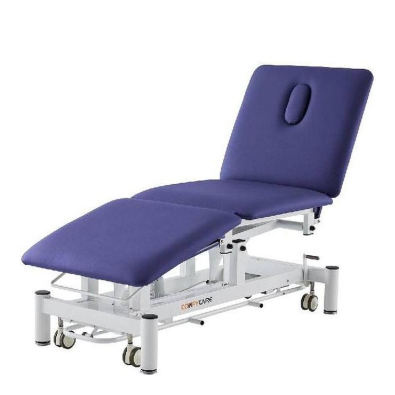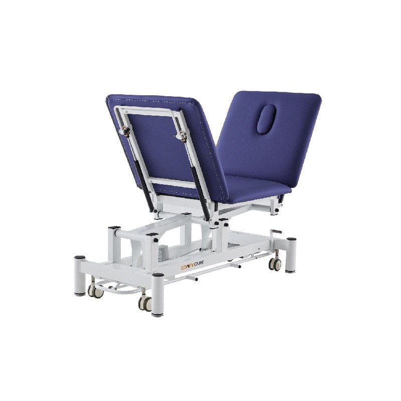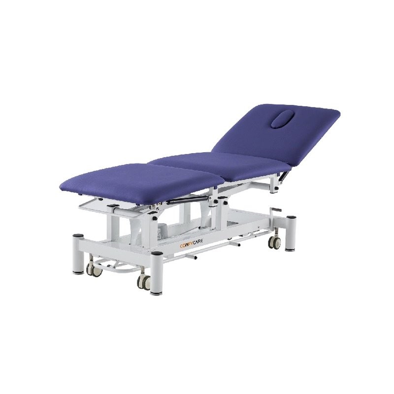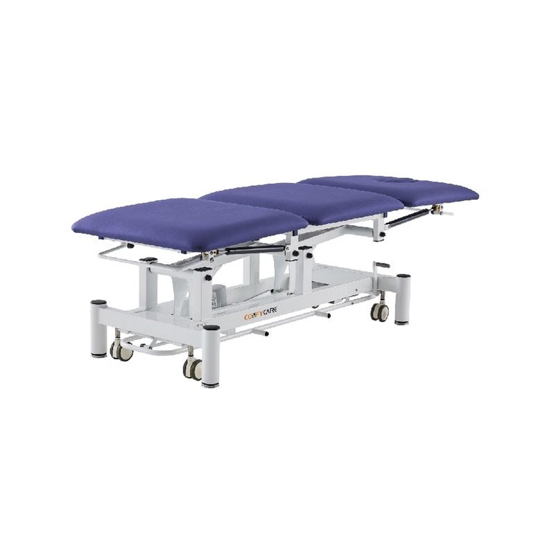 3-section treatment table ideal for medical centres, with face hole and plug. It is equipped with a motor that adjusts the height of the table. The backrest and leg section are adjustable via gas piston. Supplied as standard with paper roll holder. Features: ● Electric height adjustment via perimeter control. ● Elegant design with rounded feet for increased safety. ● Backrest with face hole and plug. ● Levelling feet for uneven surfaces. ● Retractable wheels ø 75 mm. ● High-reliability TiMOTION motor. ● Lifting time: 30 seconds. ● Padding thickness: 5 cm. ● Foam density: 36 kg/m3 ● Fire-retardant vinyl upholstery highly resistant to wear. ● Certifications: CE, FDA, ISO 13485:2016 ● Load capacity: 250 kg ● Upholstery colours (options: Blue or Grey) ● Warranty: 1 year for frame, electrical components and upholstery (except misuse).