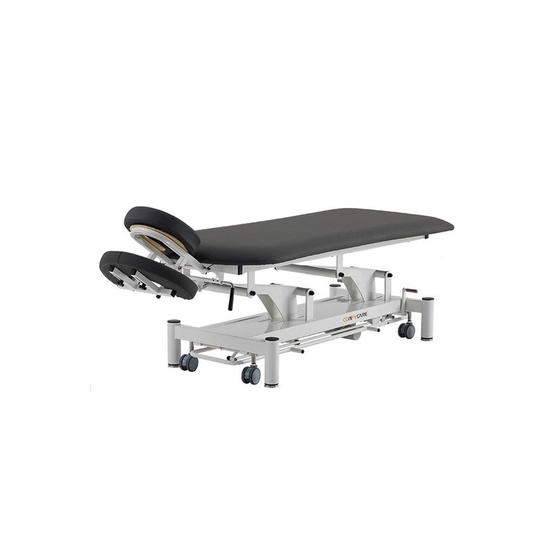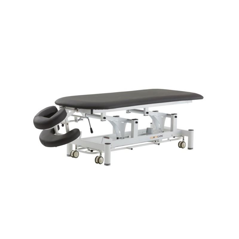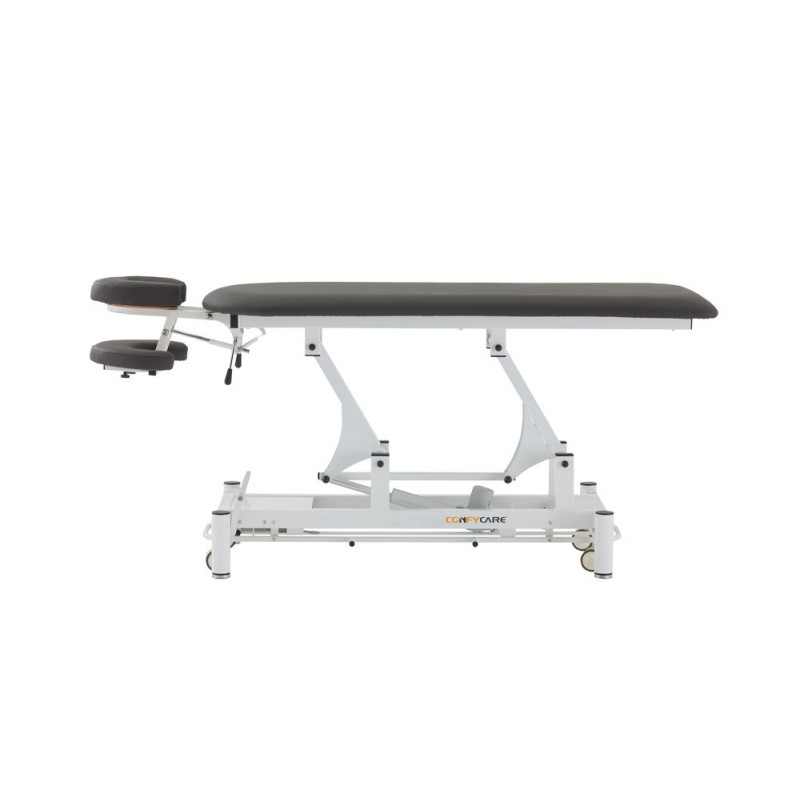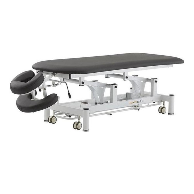 2-section treatment table specially designed for physiotherapy sessions. Headrest with facial cushion and armrests underneath. Adjustable to both negative and positive angles. The main section is contoured to make patient access easier. Standard equipment includes a paper roll holder. Features: ● Electric height adjustment via perimeter footcontroller. ● Elegant design with rounded feet for added safety. ● Tiltable headrest and armrests below the headrest. ● Levelling feet for uneven surfaces. ● Retractable castors ø 75mm. ● High-reliability TiMOTION motor. ● Lifting time: 30 seconds. ● Padding thickness: 5cm. ● Foam density: 36kg/m3 ● Fire-retardant vinyl upholstery highly resistant to wear. ● Certifications: CE, FDA, ISO 13485:2016 ● Load capacity: 250 kg ● Upholstery colours (options: Blue or Grey) ● Warranty: 1 year for frame, electrical components and upholstery (except in case of misuse).