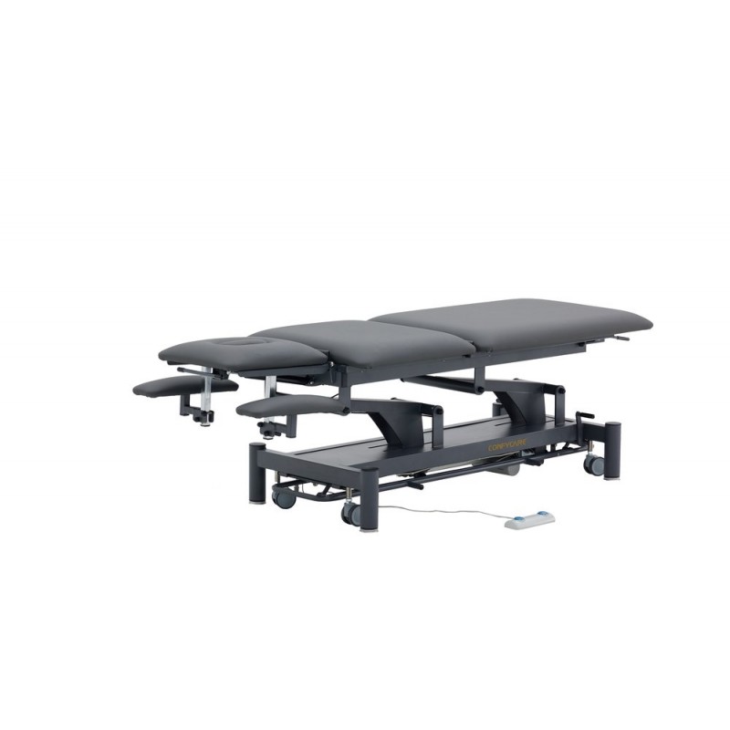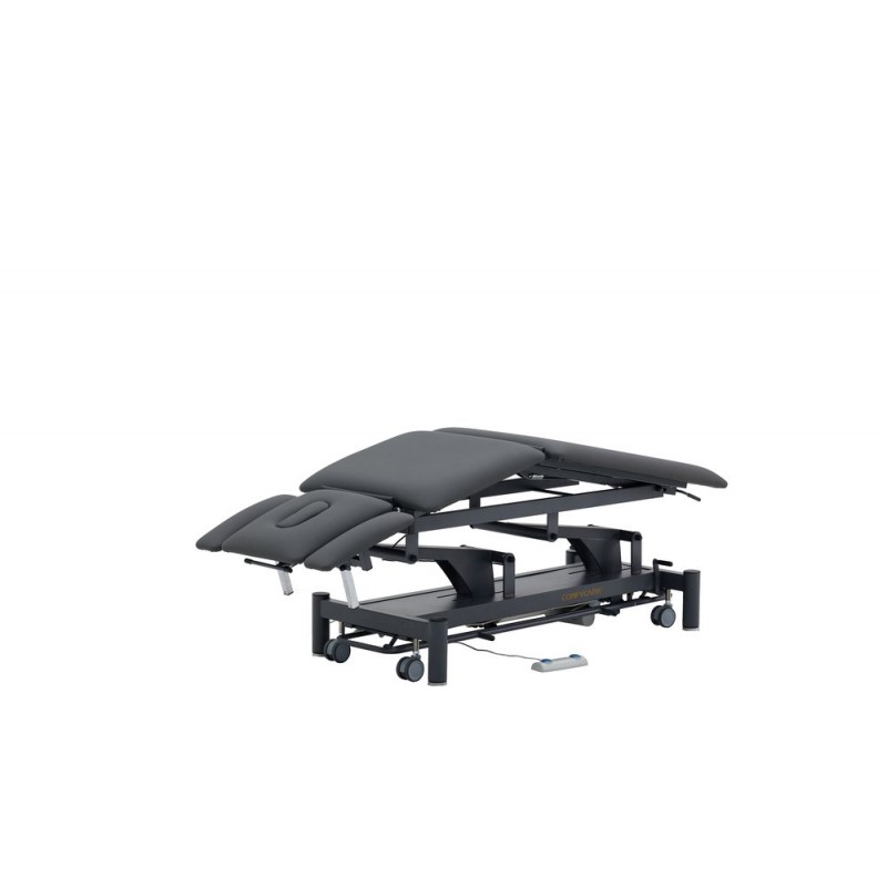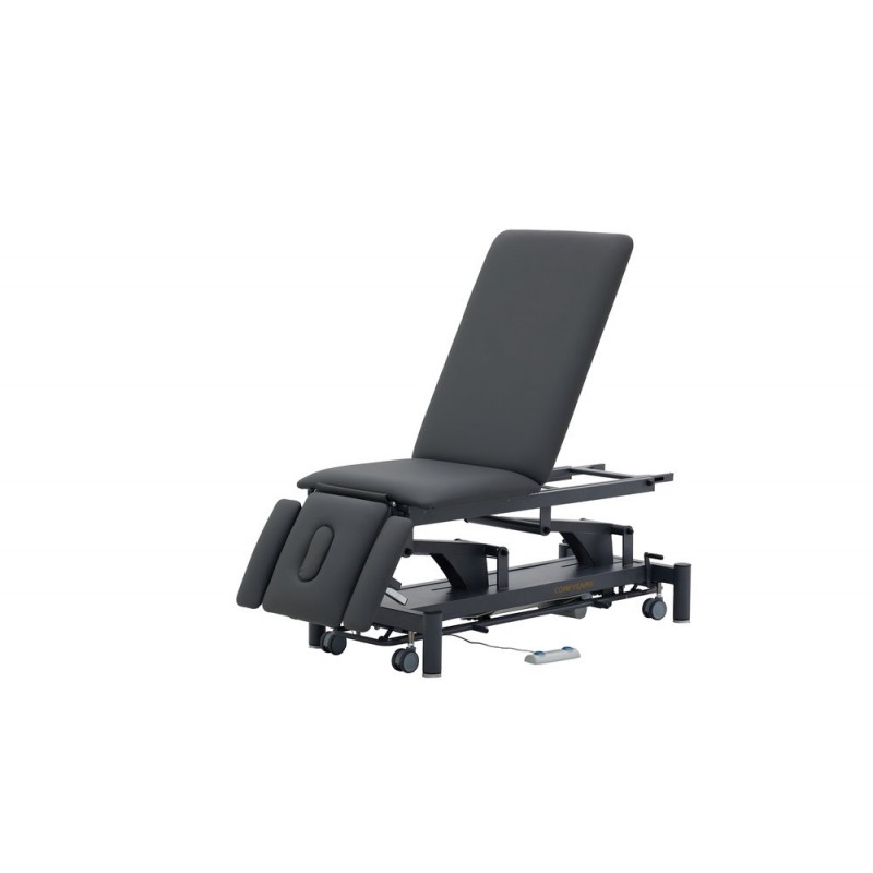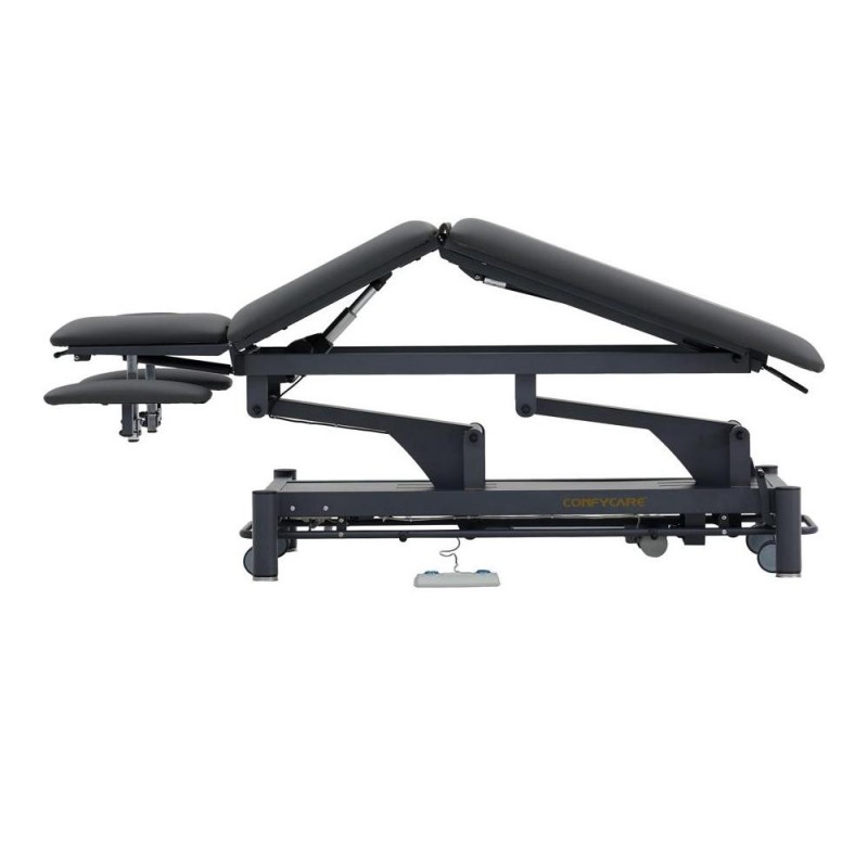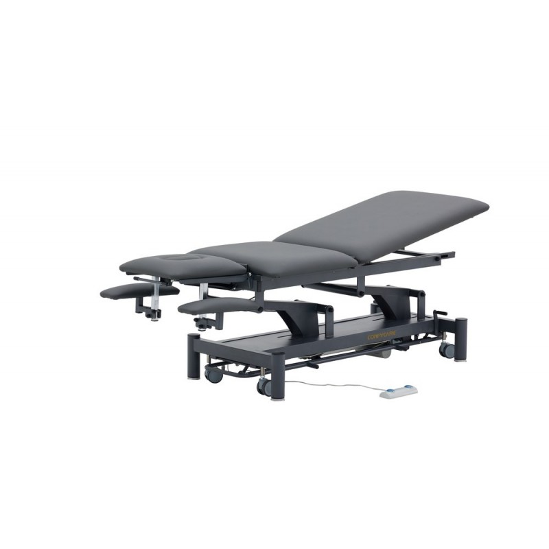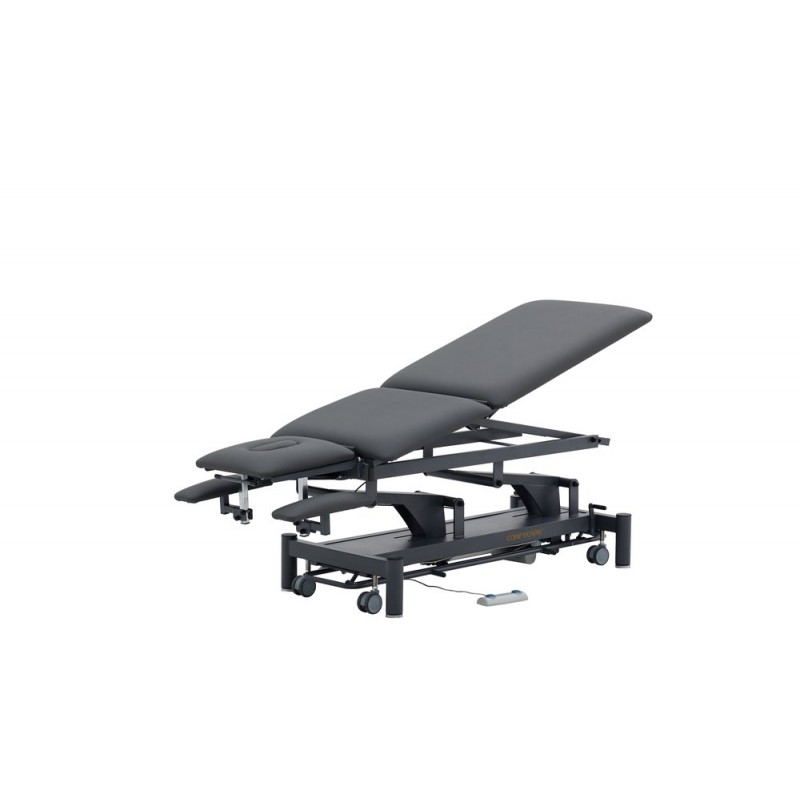 5-section physiotherapy table for a wide range of treatments. Equipped with height-adjustable armrests on the head section to ensure optimal positioning when the patient is lying face down. Comes with 2 motors: table height adjustment and electric kyphosis. Standard equipment includes paper roll holder.