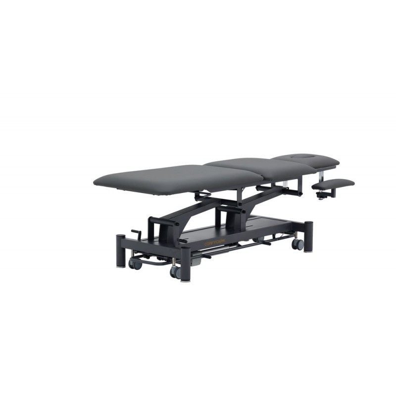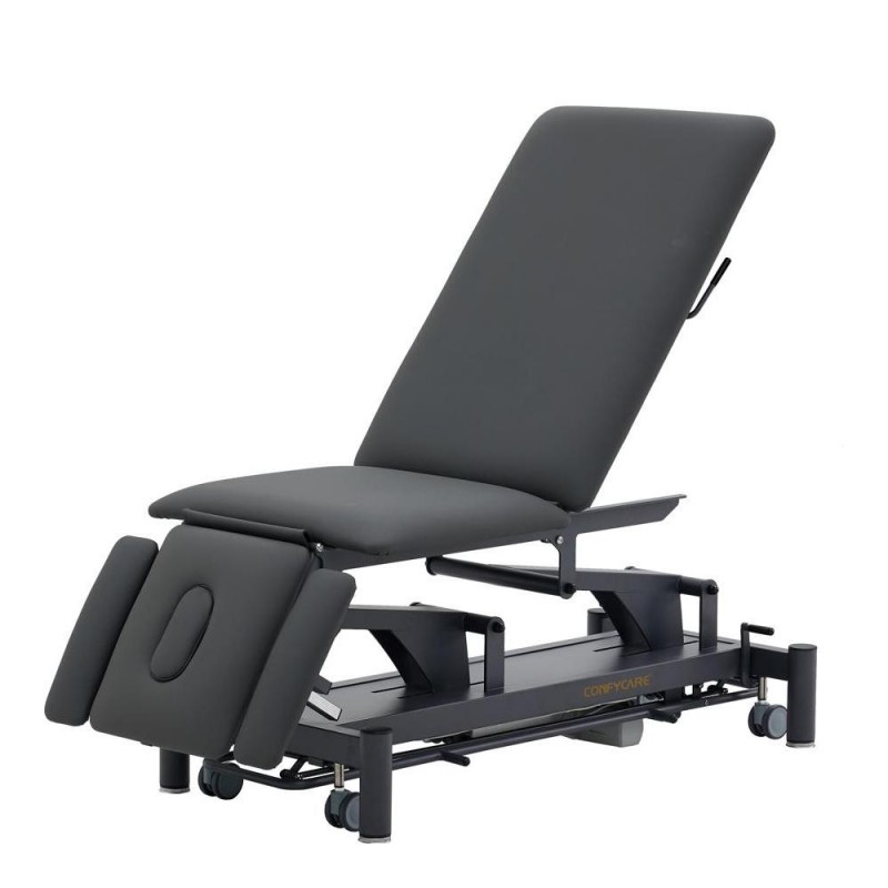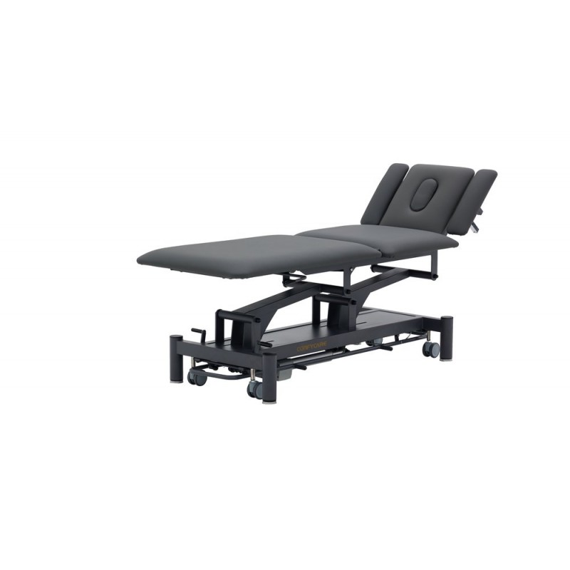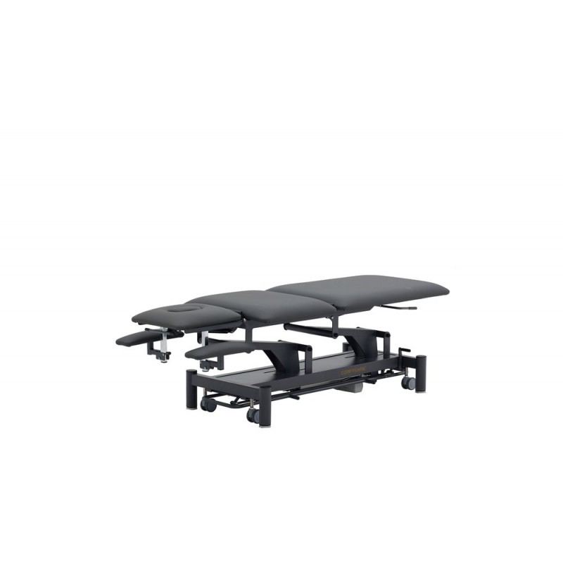 Physiotherapy and osteopathy table with 5 sections for a wide range of treatments. Equipped with armrests on the head section, adjustable in height to ensure the best position when the patient is lying in the prone position. Head section adjustable at positive and negative angles for cervical and cranial manipulation. Fixed middle section. Standard paper roll holder. Features: >● Electric height adjustment via footcontroller. ● Elegant design with rounded feet for greater safety. ● Head section with adjustable armrests. ● Head section with face hole and plug. ● Leveling feet for uneven surfaces. ● Retractable wheels ø 75mm. ● High reliability TiMOTION motor. ● Lifting time: 30 seconds. ● Padding thickness: 5cm. ● Foam density: 36kg/m3 ● Fire-resistant vinyl upholstery highly resistant to wear. ● Certifications: CE, FDA, ISO 13485:2016 ● Load capacity: 250 kg ● Upholstery colors (options: Blue or Gray) ● Warranty: 1 year for the frame, electrical components, and upholstery (except for misuse).