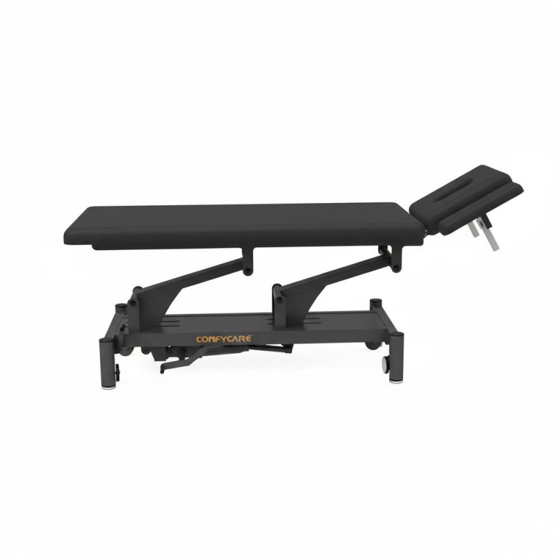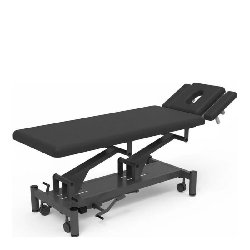 This stretcher is designed with a multi-position headrest that facilitates a greater variety of treatments and examinations. Additionally, it meets a wide range of needs related to manual handling, benefiting both the patient and the healthcare professional. FEATURES ● Height adjustable operation (Hi-Lo) via hydraulic side pedal ● Elegant design with rounded frame legs for greater safety ● Head section with armrests for maximum comfort in the prone position ● The closed base features a refined design that covers all technical parts, making the table easier to clean ● Adjustable legs for uneven surfaces and silent wheels ensuring smooth and quiet movement ● Optimized maximum and minimum height, with a lifting range of 50.5 cm ● Padding thickness: 5 cm. Foam density: 36 kg/m³ ● Upholstery: fire-retardant PVC vinyl that complies with BS 5852 standard, resistant to stains, mold, and wear (150,000 cycles) ● Weight capacity: 250 kg ● Warranty: 1 year for the chassis, electrical components, and upholstery (except for misuse)