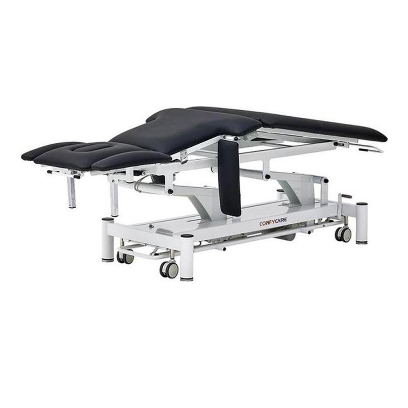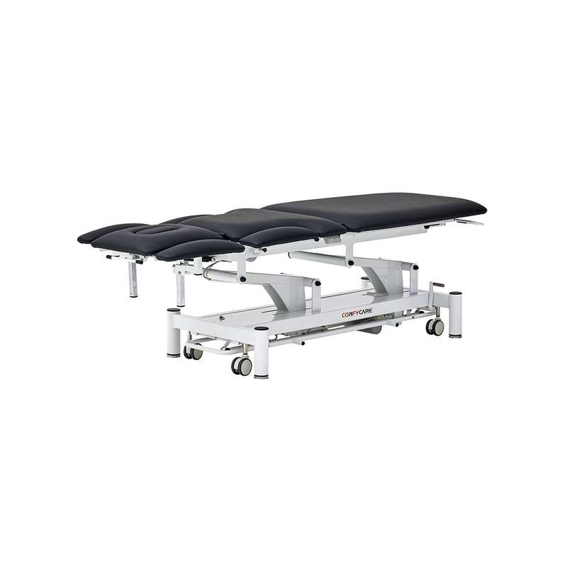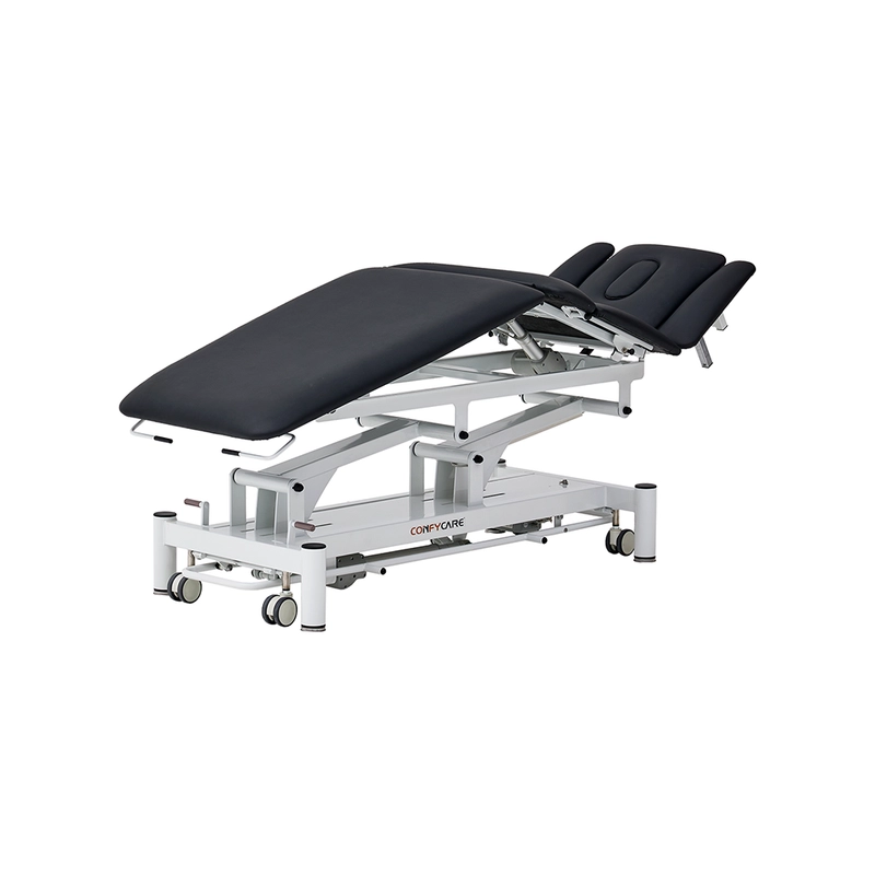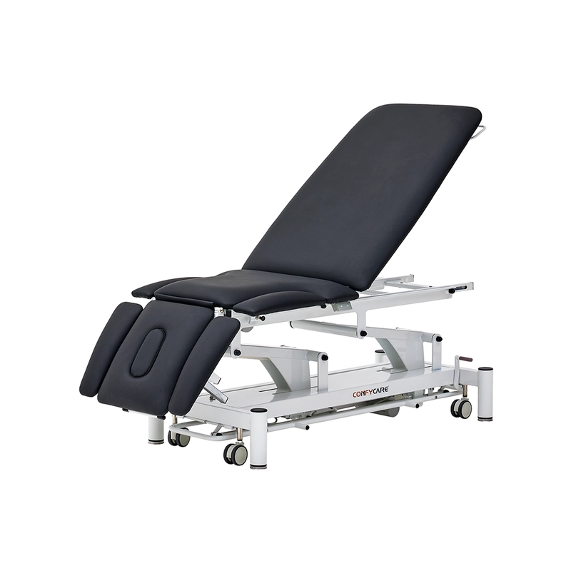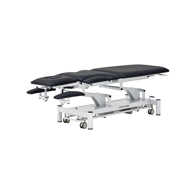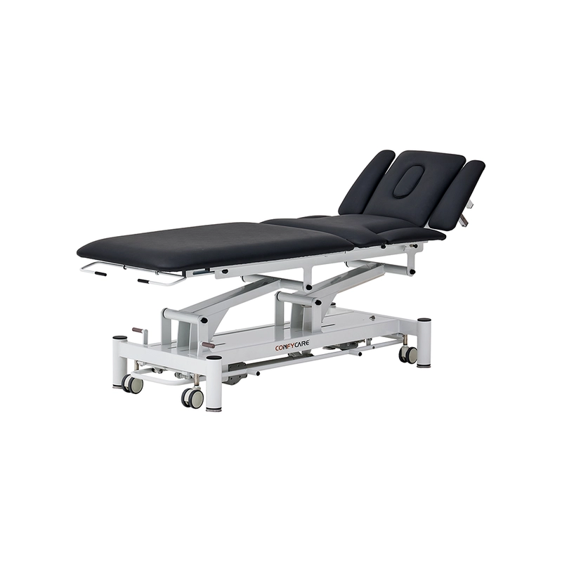 and chest section for postural drainage from 0° to +25° ● Electric height adjustment (Hi-Lo) operation via foot perimeter bar. Electric postural drainage operation via side button on the frame ● Elegant design with rounded frame legs for added safety ● Padded armrests that fold down 90° ● The head section includes a face hole and plug for maximum comfort in the prone position ● The closed base features a refined design that covers all technical parts, making the table easy to clean ● Adjustable legs for uneven surfaces and silent wheels ensuring smooth and quiet movement ● Reliable TiMOTION motor ● Optimized maximum and minimum height with a lifting range of 50 cm ● Padding thickness: 5 cm. Foam density: 36 kg/m³ ● Upholstery: flame-retardant PVC vinyl that complies with BS 5852 standard, resistant to stains, mold, and wear (150,000 cycles) ● Weight capacity: 250 kg ● Certification: CE-certified and registered with the U.S. FDA ● 1-year warranty